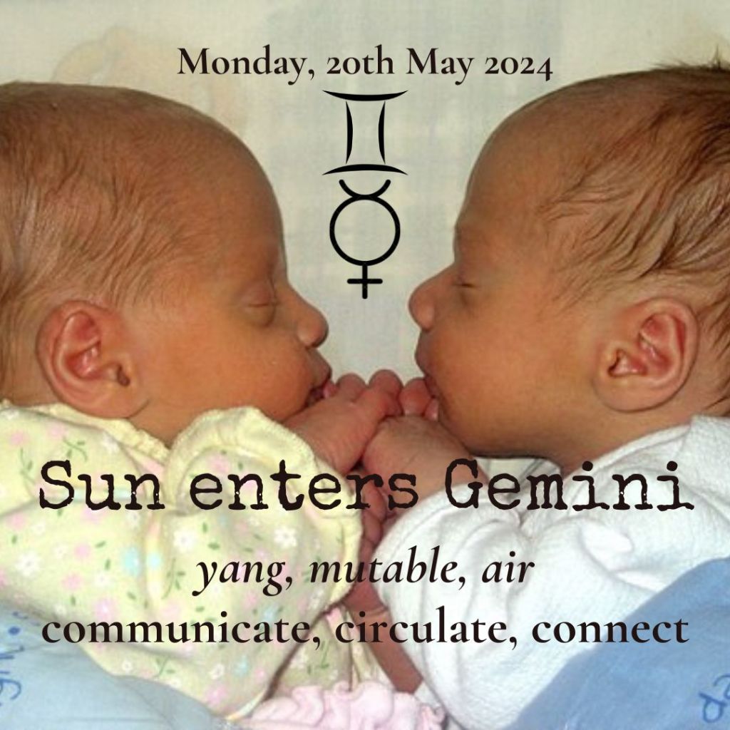 The stability of Taurus is forgotten. The wind is now blowing, connecting each one of us with its breath. As our Sun enters the sign of the Twins, the first Air sign of the Zodiac. It’s seeking to communicate and to circulate. T