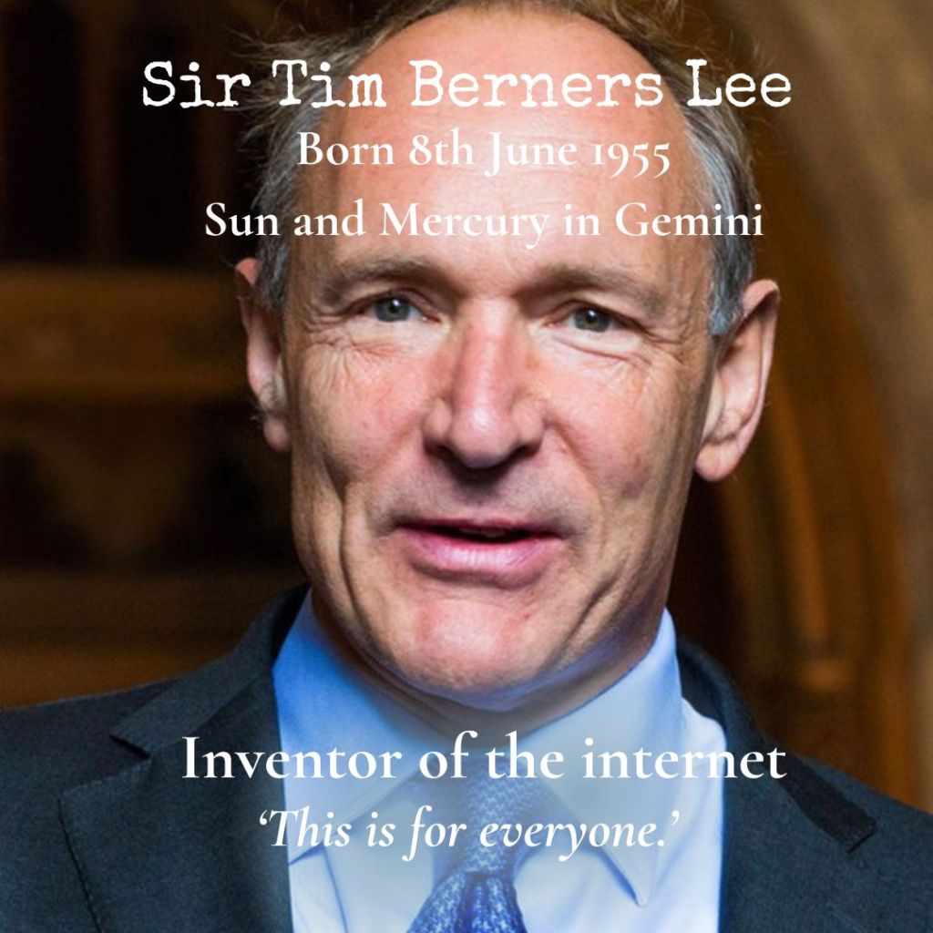 No surprise that Sir Tim Berners-Lee, inventor of the internet is a Gemini. Born 8th June 1955, he has both the Sun and Mercury in the sign of the twins. His gift to the globe has changed our planet forever. He has connected us all in a way that until relatively recently, was the realm of science fiction.