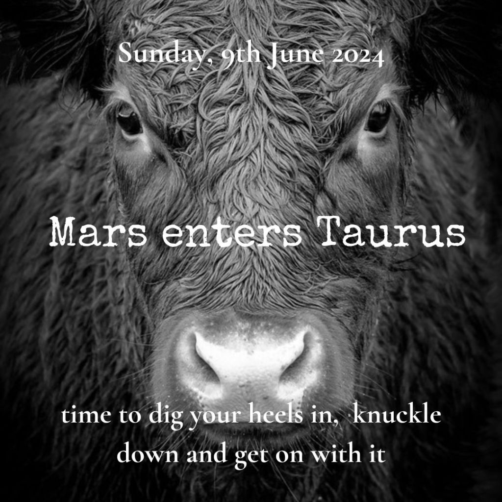 So, Mars entering Taurus signifies a time to dig your heels in, to knuckle down and get on with it. The stage was set in Aries, now you have to plough steadily forward and finish what you started.