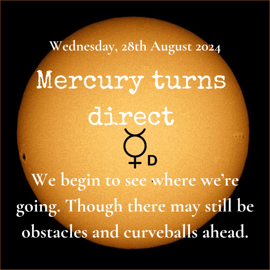 Mercury turns direct at 21 deg 24’ Leo on 28th August 2024 at 22h14 BST