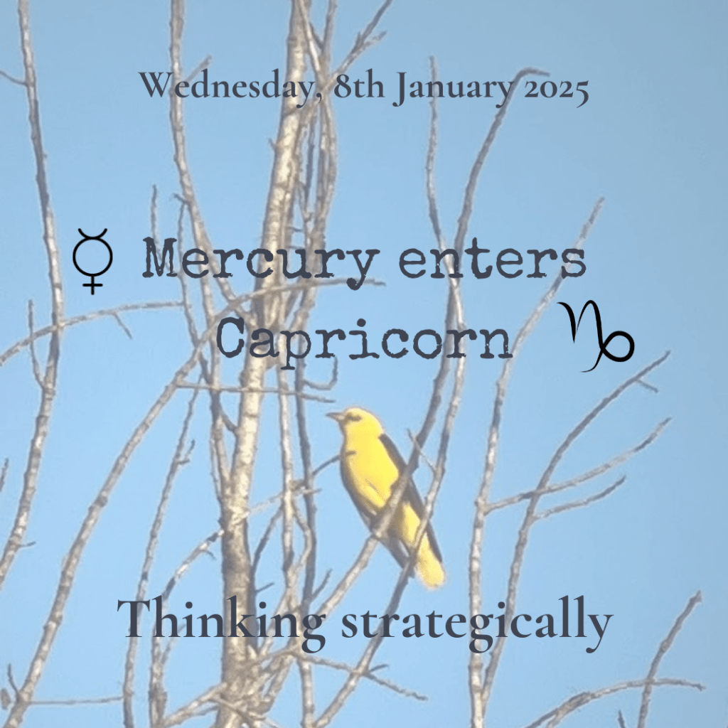 Capricorn ruler Saturn is still in compassionate, imaginative and occasionally unrealistic Pisces, and action planet Mars is retrograde, so Mercury in Cap is currently more about planning and thinking strategically than taking action.