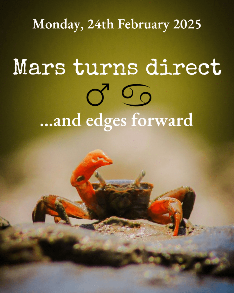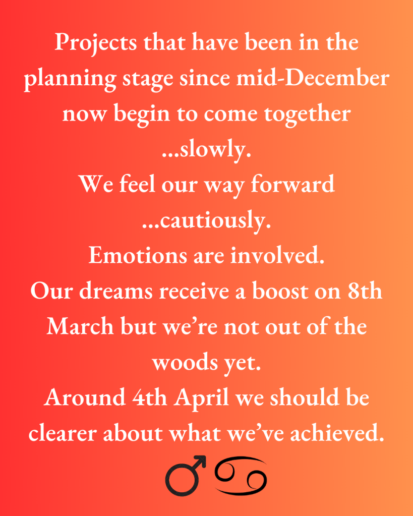 Mars in Cancer is both imaginative and self-protective. It proceeds with care but also with a certain determination. Our resolve, or the situation/project, is likely to strengthen on 8th March when it receives benevolent rays from the Sun and is joined by the Moon, strong in her own sign.