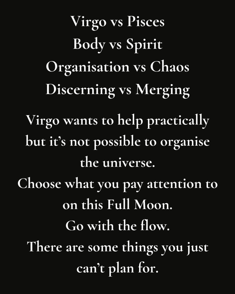 So, you may be feeling all over the place and more than a little emotional as you try to shift and adapt to a new situation in the area of life represented by this Virgo Full Moon.