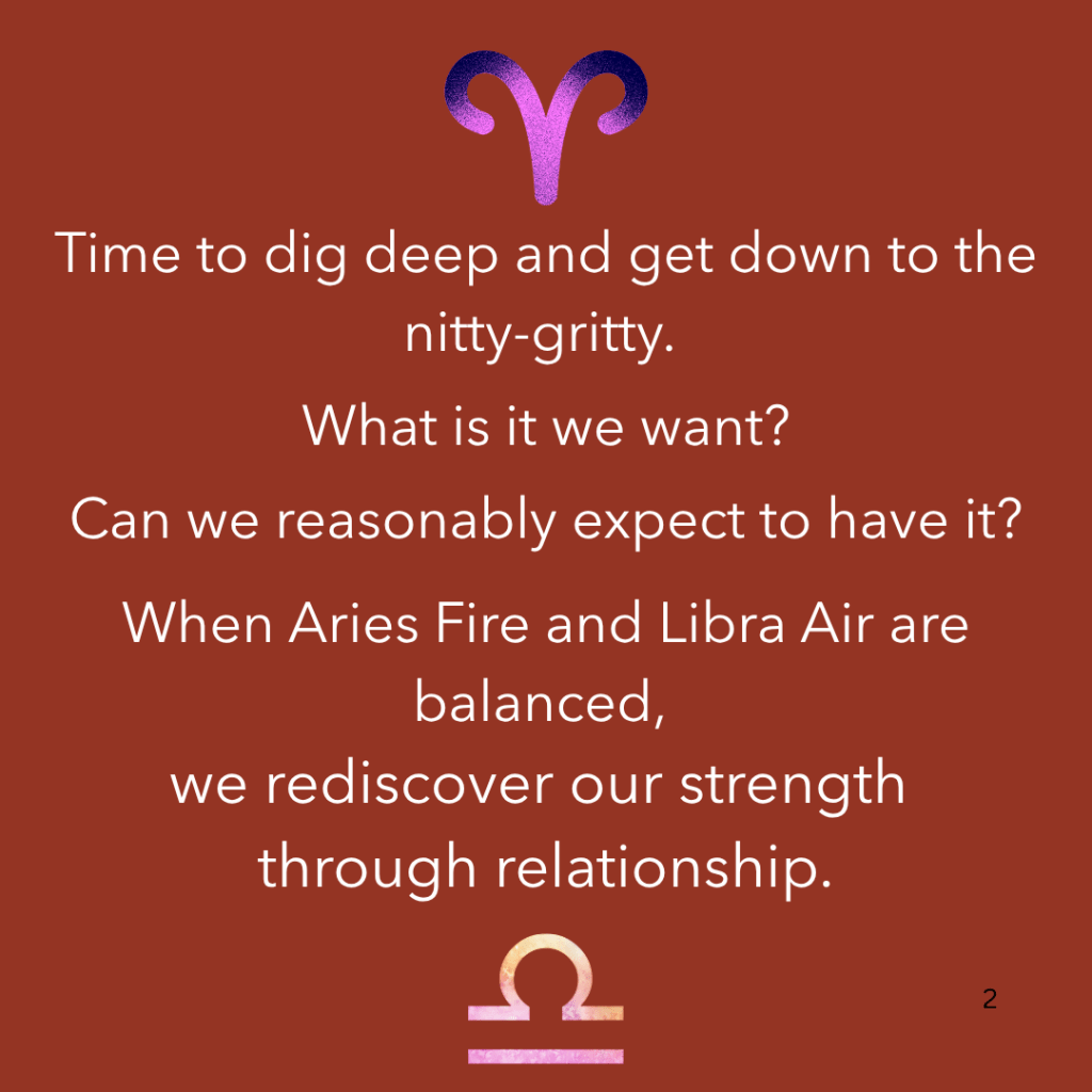 Light a candle perhaps, or safely light a bonfire to honour this Moon and consider the balance between Fire (Aries) and Air (Libra). Air is warmed by fire. Fire offers light. The air, however, is necessary for fire to come alive and flourish. Too much air and fire goes out or goes on the rampage. Too much fire and the air is unbreathable. When in balance, the fire burns steadily, warm, inspiring and brave, while the air circulates freely around it with clarity of mind and insightful judgement. This is our goal.
