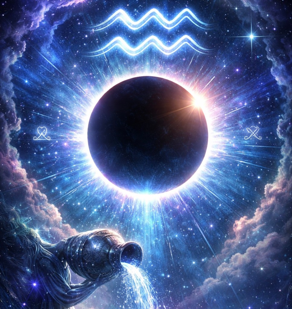 New Moon at 28 deg 49’Aquarius, at 12h01 UT, 17th February 2026; Annular Solar Eclipse 12h12 UT